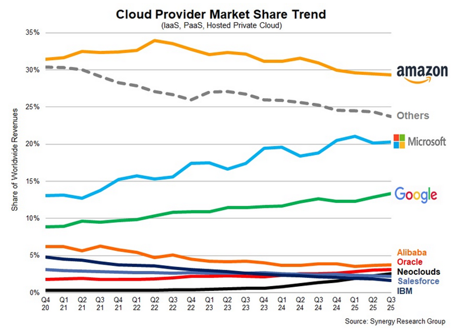 One important factor to note is that a small handful of companies, including leading giants like Amazon, Microsoft, and Google, control a large share of the market.