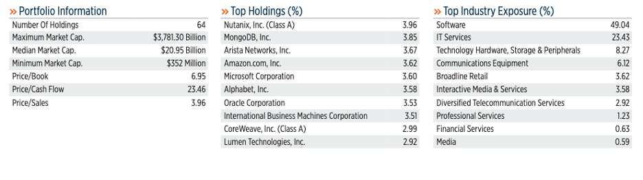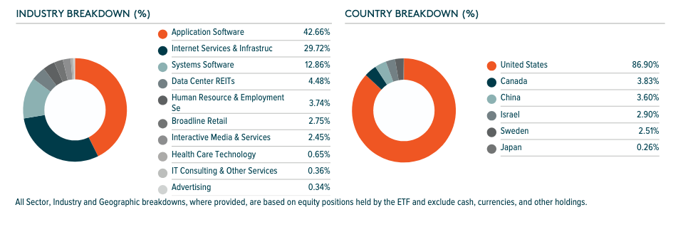 The First Trust Cloud Computing ETF targets smaller and large cloud computing companies, including leading giants like Amazon, Alphabet, and Microsoft. This ETF is also a bit less diversified, as the top 10 holdings account for around 38% of its assets.