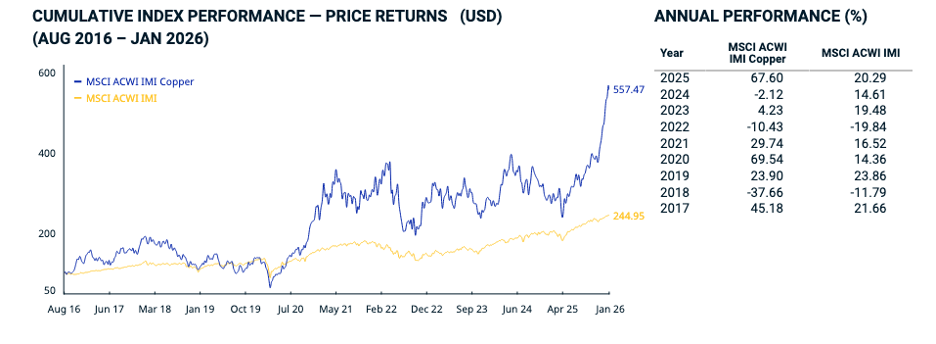 During the past decade, the price of copper has soared from around $2/lb to nearly $6/lb. Copper mining stocks entered a massive bull market at the beginning of 2020, outperforming the MSCI All Country World Index by over 300 percentage points between August 2016 and January 2026.
