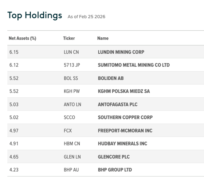The iShares Copper and Metal ETF is another ETF to consider, but this ETF focuses on both copper mining and metal ore mining companies. However, these ETFs share many of the same top 10 holdings and may have somewhat similar performance due to their common exposure to copper mining equities.