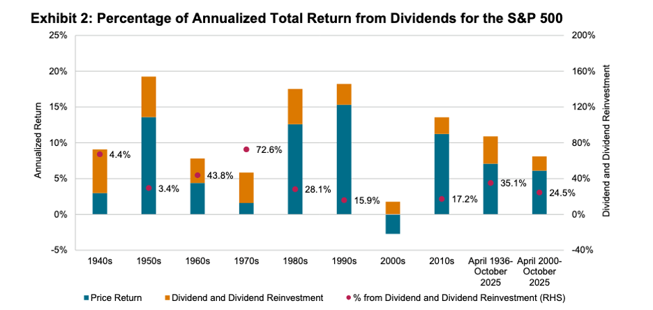 During riskier and inflationary cycles, such as the 1970s, dividend income was a major driver of the market’s return.